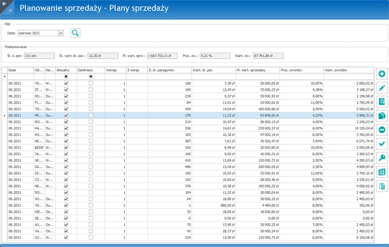 Osiągnięcie oczekiwanych zysków zależy od uzyskania odpowiedniego poziomu sprzedaży. Funkcjonalność planowania sprzedaży umożliwia szczegółowe zaprojektowanie parametrów sprzedażowych dla każdego sklepu, na każdy dzień miesiąca. Narzędzie daje sposobność do określania oczekiwanej wartości sprzedaży, liczby paragonów, średniej wartości jednego rachunku, ale również wartości dokonywanych zwrotów czy stosunku zwrotów do wszystkich transakcji. To funkcje niezbędne dla kierownika chcącego prowadzić szczegółowe analizy prowadzonej sprzedaży w punktach. Zestawienia i raporty generowane z systemu ERP dają możliwość oceny efektywności sprzedaży w czasie, w ramach całej sieci. Pozwalają wyłonić placówki cechujące się wysoką i niską rentownością, a także weryfikują skuteczność długoterminowych kampanii marketingowych i jednorazowych akcji promocyjnych.
