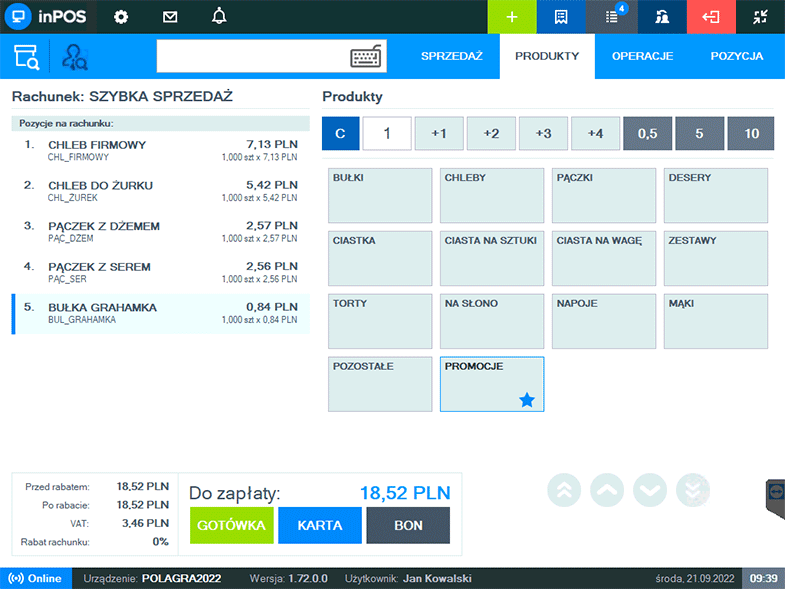 Intuicyjne mechanizmy zaimplementowane w interfejsie oprogramowania na urządzeniu POS (czytaj więcej -> inPOS) maksymalnie skracają czas obsługi klienta, opowiadając tym samym na wyzwania kasjerów, którzy odpowiedzialni są za utrzymanie szybkiego tempa sprzedaży. Płynne dodawanie pozycji na rachunek za pomocą skanera kodów kreskowych, wyszukiwarki produktów i kodów PLU, niezawodna fiskalizacja w trybie online oraz offline, a także obsługa różnych form płatności w wielu walutach (gotówka, karta, bony własne i obce oraz płatności mieszane) stanowią podstawę sukcesu procesu sprzedaży.